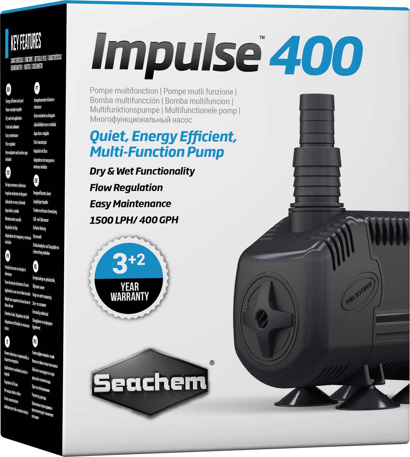 The Impulse™ is a quiet, energy-efficient, multi-function pump. It is ideal for fresh and saltwater aquariums, protein skimmers, indoor fountains, water-cooling and all similar submersible and inline applications which require energy efficient, ultra quiet performance. The Impulse™ is equipped with a synchronous motor and an advanced impeller, ceramic shaft and bearings (stainless steel on the Impulse™ 400), and an adjustable flow rate. Multi-size hose adapter fittings and suction cups are included.