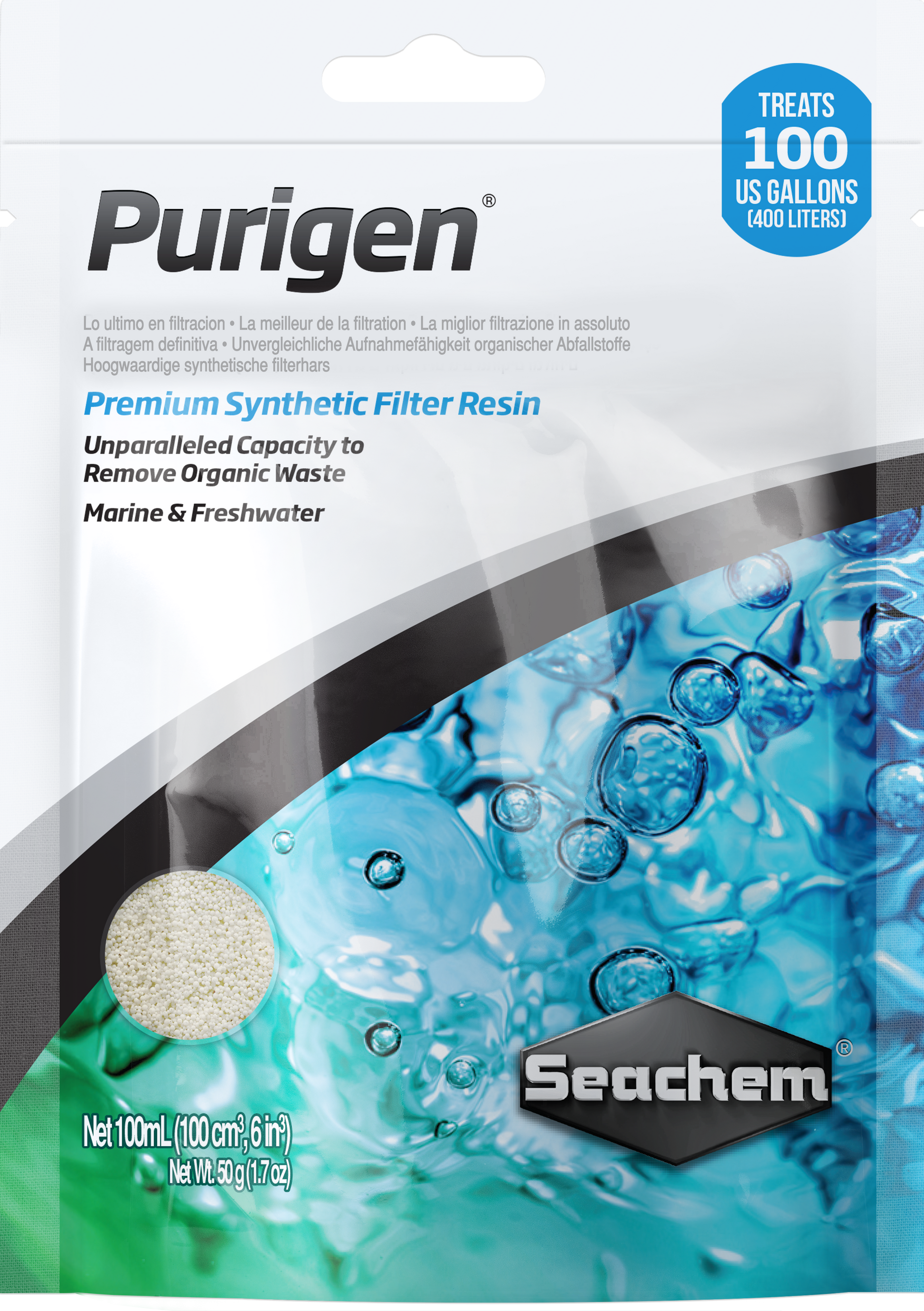 Purigen® is a premium synthetic adsorbent that is unlike any other filtration product. It is not a mixture of ion exchangers or adsorbents, but a unique macro-porous synthetic polymer that removes soluble and insoluble impurities from water at a rate and capacity that exceeds all other competing products by over 500%. Purigen® controls ammonia, nitrites and nitrates by removing nitrogenous organic waste that would otherwise release these harmful compounds. Purigen’s impact on trace elements is minimal. It significantly raises redox. It polishes water to unparalleled clarity. Purigen® darkens progressively as it exhausts, and is easily renewed by treating with bleach. Purigen® is designed for both marine and freshwater use.